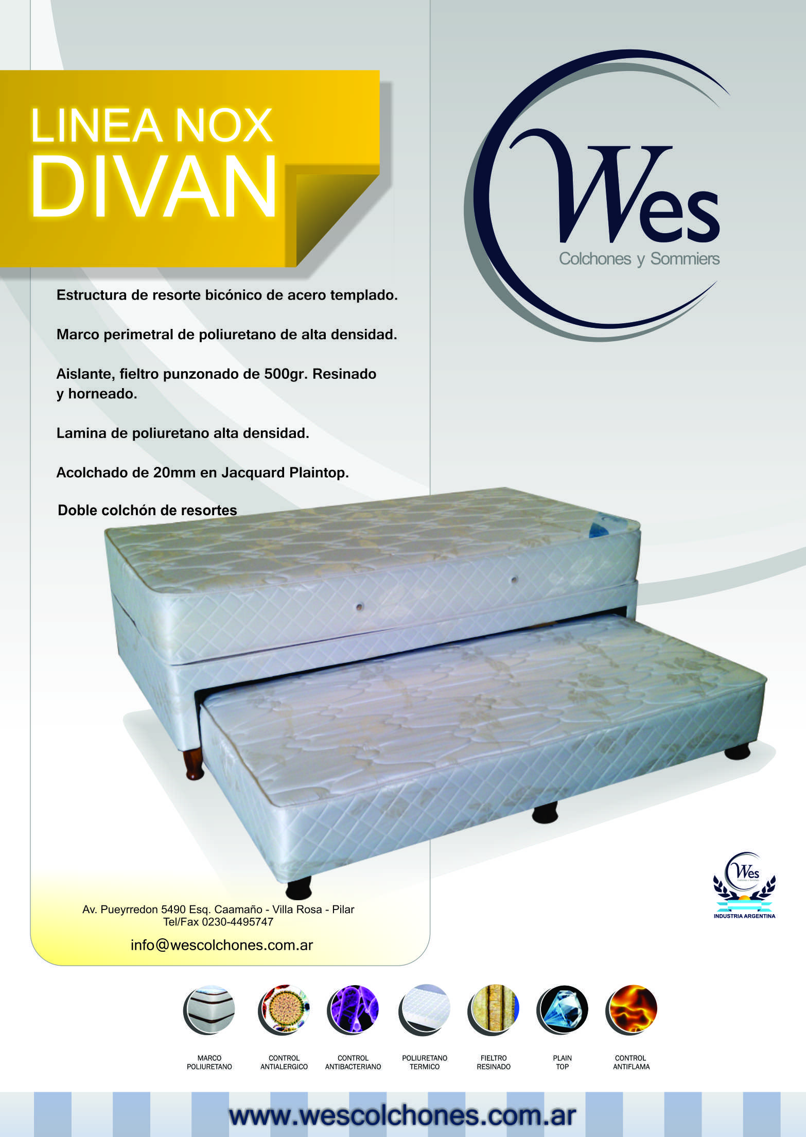 | CARACTERÍSTICAS y DISEÑO Línea Nox construido 100 % en Jacquard color Beige estampado, su medida es de 100 x 190. Ambos colchones cuentan con una base de resortes bicónico que se complementa con una capa de confort de 25 milímetros, lo cual brinda la estructura perfecta para un descanso ideal. Este modelo cuenta con marco perimetral de poliuretano de alta densidad que ofrece una mayor firmeza al colchón ampliando sus laterales y permitiendo un mayor disfrute de toda la superficie. Diseñado para personas de hasta 100 kg. Es un producto práctico, funcional, ideal para recibir huéspedes o para espacios reducidos, la parte inferior posee tres patas fijas para evitar desplazamientos una vez extraído y tres patas con ruedas para quitarlo de forma fácil y simple de su interior, al igual que es sumamente sencillo su guardado.-Tipo de producto: Diván -Marca: Wes -Modelo: Nox -Medida: 100 x 190 cm. Tamaño: 1 ½ plazas -Altura total: 61 cm -Tecnología: Resorte -Tipo de Resorte: Bonnell de acero templado bicónico -Material de la base: madera de álamo estacionado -Superficie de contacto: Jacquard matelaseado -Base de Sommier con tela Anti deslizante -Garantía: 5 años |